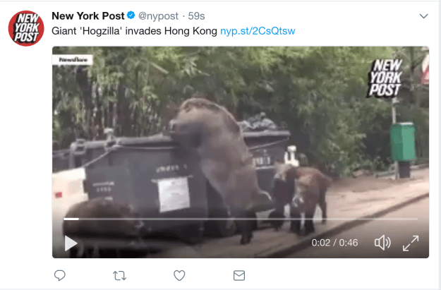 By now I have a sick feeling inside that people might be getting a bit sick and tired of the fantastic actor Dwayne “The Rock” Johnson (His daughter happens to be my neighbor, not that that affects my opinion on him). People may scoff and ignore his next major Blockbuster release Rampage. Well how the fuck can you scoff now when the plot of it is basically happening right there there in Hong Kong. Like twice the length of the other puny hogs around him and with roughly 5000% more muscle bulk than the others. Honestly must be like a god amongst them. I mean I’ve always heard that pigs and hogs only have feeding and breeding on their mind which is why they get castrated on farms, so they only eat and grow massive for meat. Well if they can get their brains together for one second and realize they have a leader who can take on humans and rule the world if we were just going hand to hand. I mean short of a 50 cal bullet I’m not even sure other calibers can take Hogzilla out. I mean yea i know shit head poachers take out Elephants all the time but Hogs are a whole nother animal entirely, literally. Same logic where a 9mm can probably shoot any person but when a crazy coked out juiced meth head comes charging at you. It’s gonna take a couple .45 probably. Well same logic as hogzilla except times 100 and bullets look like they’ll bounce off him when he charges the streets of Hong Kong. I mean it’s eating trash! It’ll eat anything and every thing and continue to bulk up. That includes, half eaten steaks, bullets, trash, humans, skulls, etc. Guy’s such a monster it almost makes me think he’s a marketing ploy now just so people watch Rampage. I don’t want to know monsters can happen naturally out there in the wild.